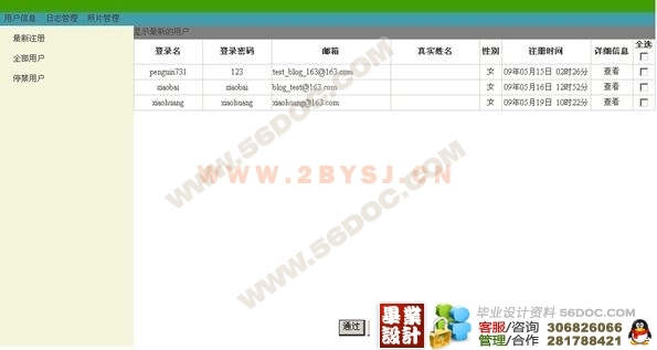 系统管理员主要对用户博客内容进行管理。删除用户发表的日志,上传的照片以及留言等,还拥有禁用、解禁、删除用户帐号的权限。