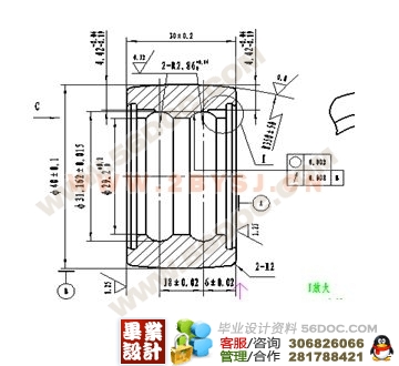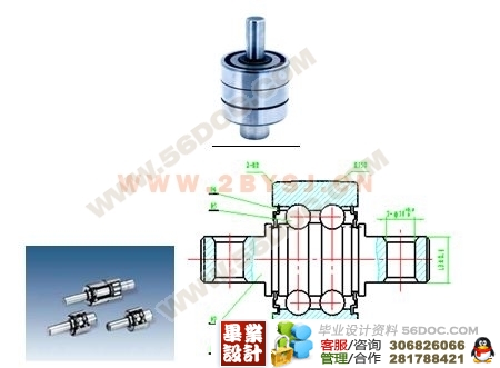 本课题所涉及到的是叉车两侧的滚动轴承,这类轴承很一般的深沟球的工作原理基本一样,所不同的是该轴承是双滚道,内圈固定在车体上,外圈旋转并起一定的支撑作用。如该产品由内圈,外圈,滚动体密封槽组成,他于一般深沟球轴承的区别在与:他是双滚道,没有保持架,内圈由轴做成,轴的两段各有一个孔,他是用来安装用的,用螺栓连接在车架上,内圈固定外圈旋转,为防止灰尘等一些杂物进入滚道影响轴承的旋转精度,在轴承的两端装有密封圈来防止硬度大的颗粒进入滚道,同时还可以提高轴承的使用寿命。